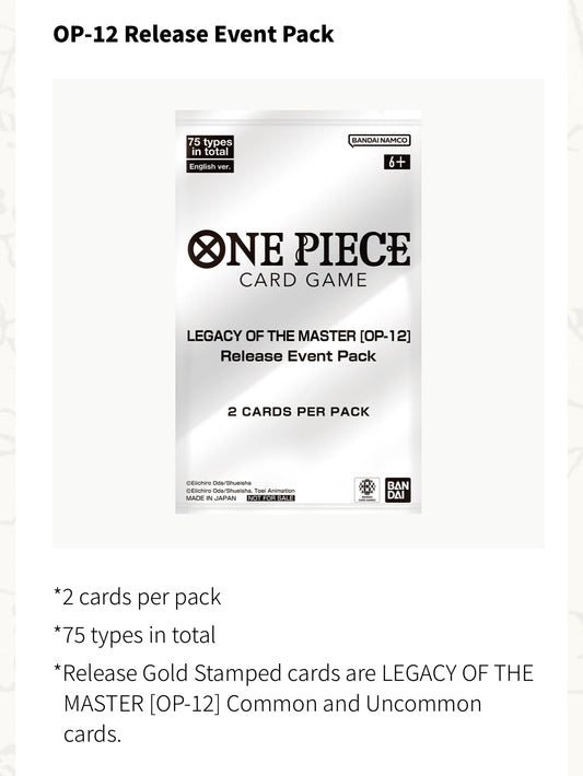 ONE PIECE CARD GAME OP-12 Release EventVendor:One PieceRegular price $60.00 CADRegular priceUnit price / per$5.00 CADSale price $60.00 CADSold out