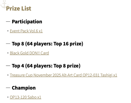ONE PIECE CARD GAME Store Treasure Cup Fri. November 21, 2025 05:00 PMVendor:One PieceRegular price $32.00 CADRegular priceUnit price / per-