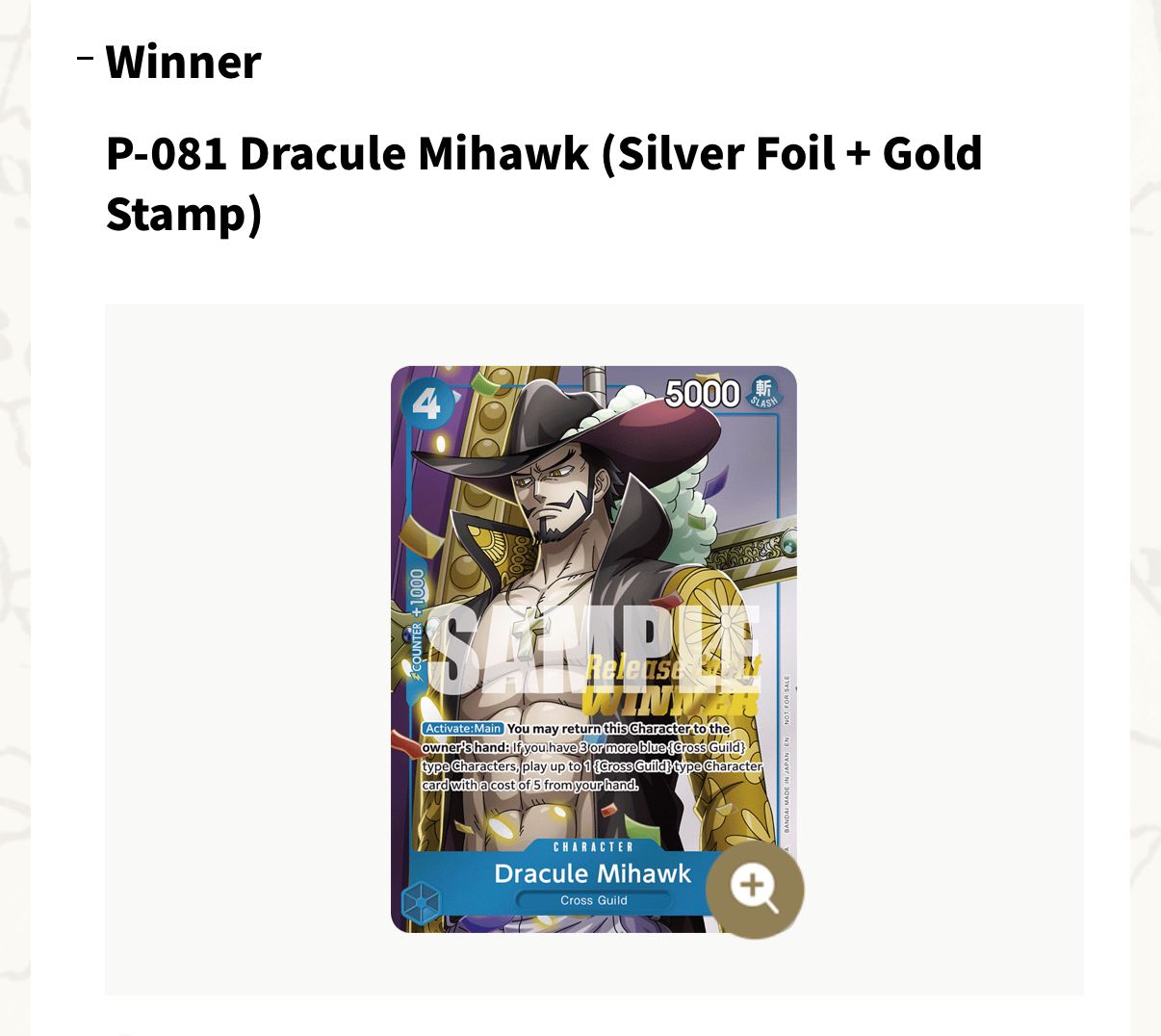 - 1 x P-081 Promo Dracule Mihawk Silver Foil + Gold Stamp ( WINNER CARD )