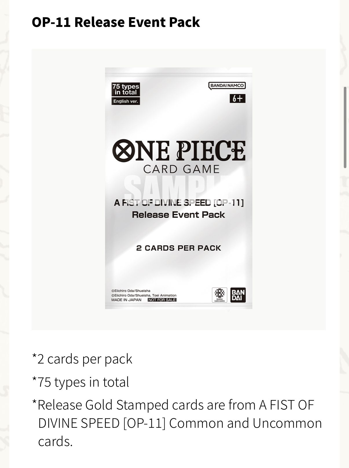 - 1 OP11 release event pack (2 Cards per Pack)
